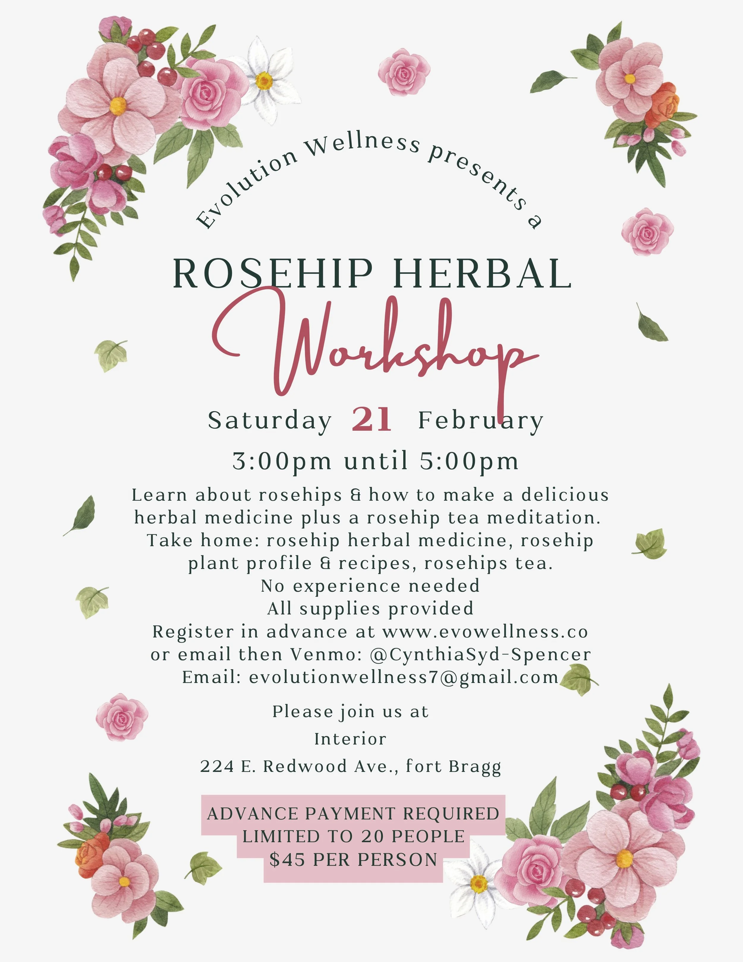 To register email Cynthia at evolutionwellness7@gmail.com to confirm your spot,